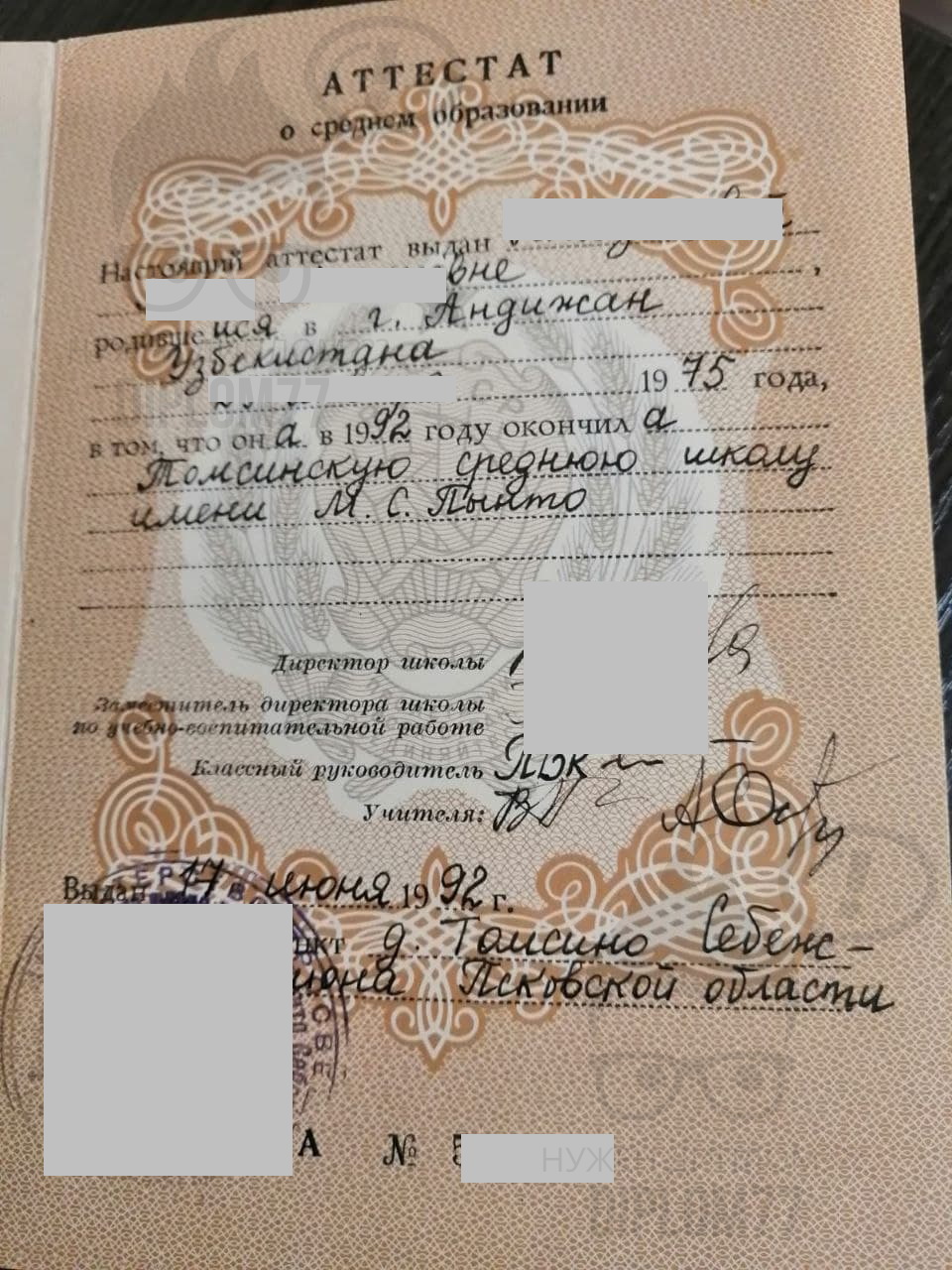 Ответ: Здравствуйте. Аттестат Узбекской ССР не сможем сделать. Только РСФСР есть бланки. Аттестат о средней (полном) общем образовании 1990 года выдачи будет стоить 25 000 рублей. Делается за 3-4 дня и плюс время доставки. Заказать документ можно (текущая страница). Подробнее о вариантах оплаты и доставки здесь: https://diplom77k.cfd/dostavka