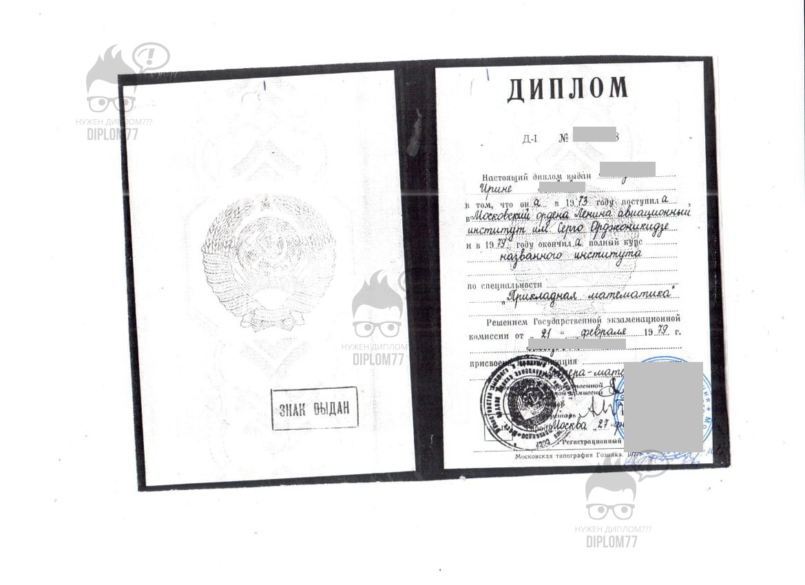 Диплом считается очень важным официальным документом. Он нужен человеку на протяжении всей его жизни. Часто можно услышать об утрате этого документа бывшими гражданами СССР. И тут появляется серьёзная проблема, часто неразрешимая. Восстановить его практически невозможно. Часто сам ВУЗ или не существует или находится на территории другого государства. Но для нас нет проблем изготовить такой диплом. Диплом77 готов Вам помочь купить диплом советского образца (СССР).