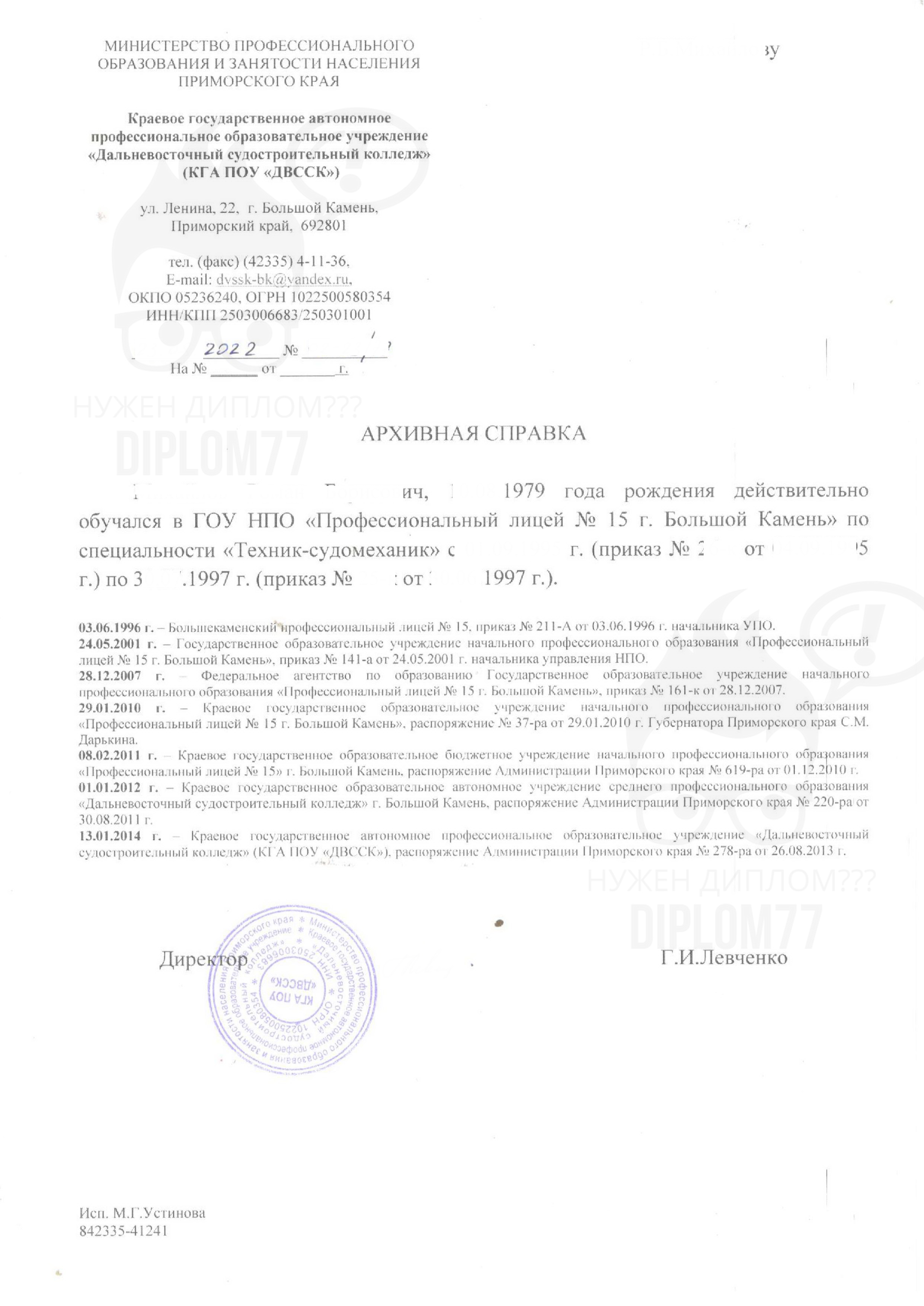 Ответ: Здравствуйте. Справка о прохождении обучения в училище (архивная) стоит 10 000 рублей. Делается за 1-2 рабочих дня и плюс время доставки. Заказать документ можно (текущая страница). Подробнее о вариантах оплаты и доставки здесь: https://diplom77k.cfd/dostavka