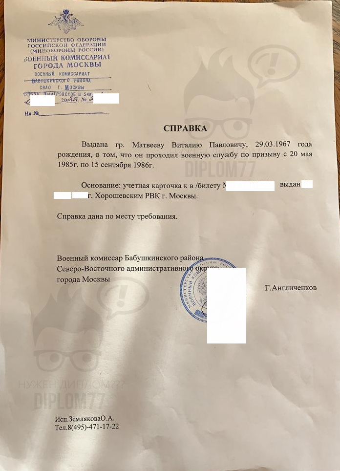 Архивная справка из военкомата Бабушкинского района СВАО г. Москвы выданная в 2022 году о прохождении воинской службы