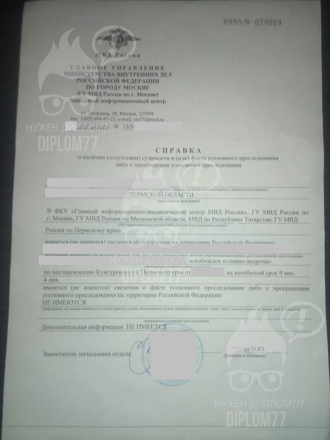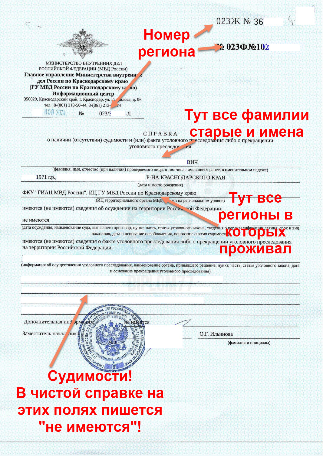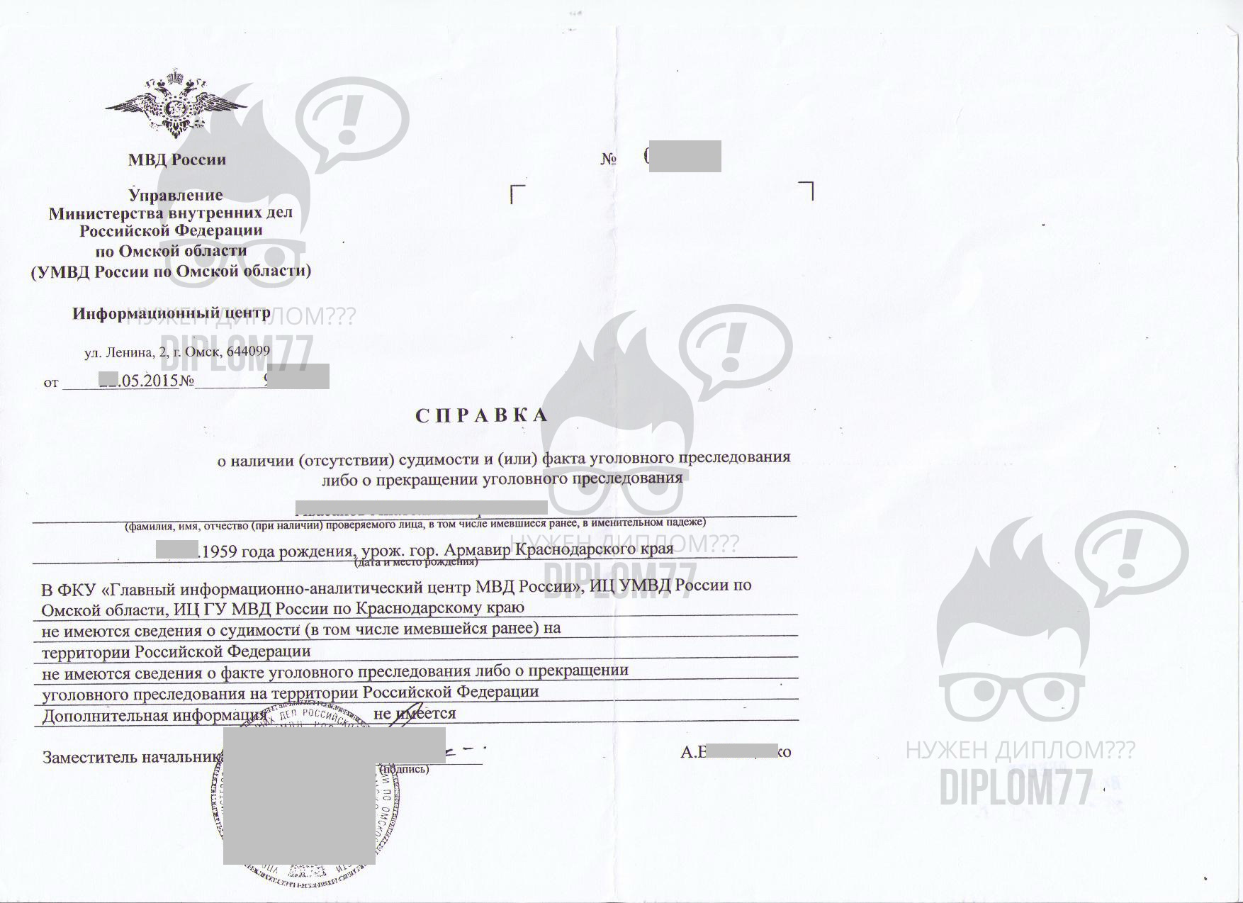 Справка об отсутствии судимости сегодня требуется в большом количестве жизненных ситуаций. Но что делать, если судимость была? Пусть она уже погашена, но зачем это показывать другим людям? Наилучшим решением будет купить справки о несудимости. И Диплом77 поможет вам это сделать максимально быстро и качественно. Мы много лет занимаемся изготовлением этих справок ещё с тех далёких времён когда их делали даже в ИЦ МВД на обычной белой бумаге. Поэтому мы можем сделать справку о несудимости с любого региона РФ (есть абсолютно все образцы).