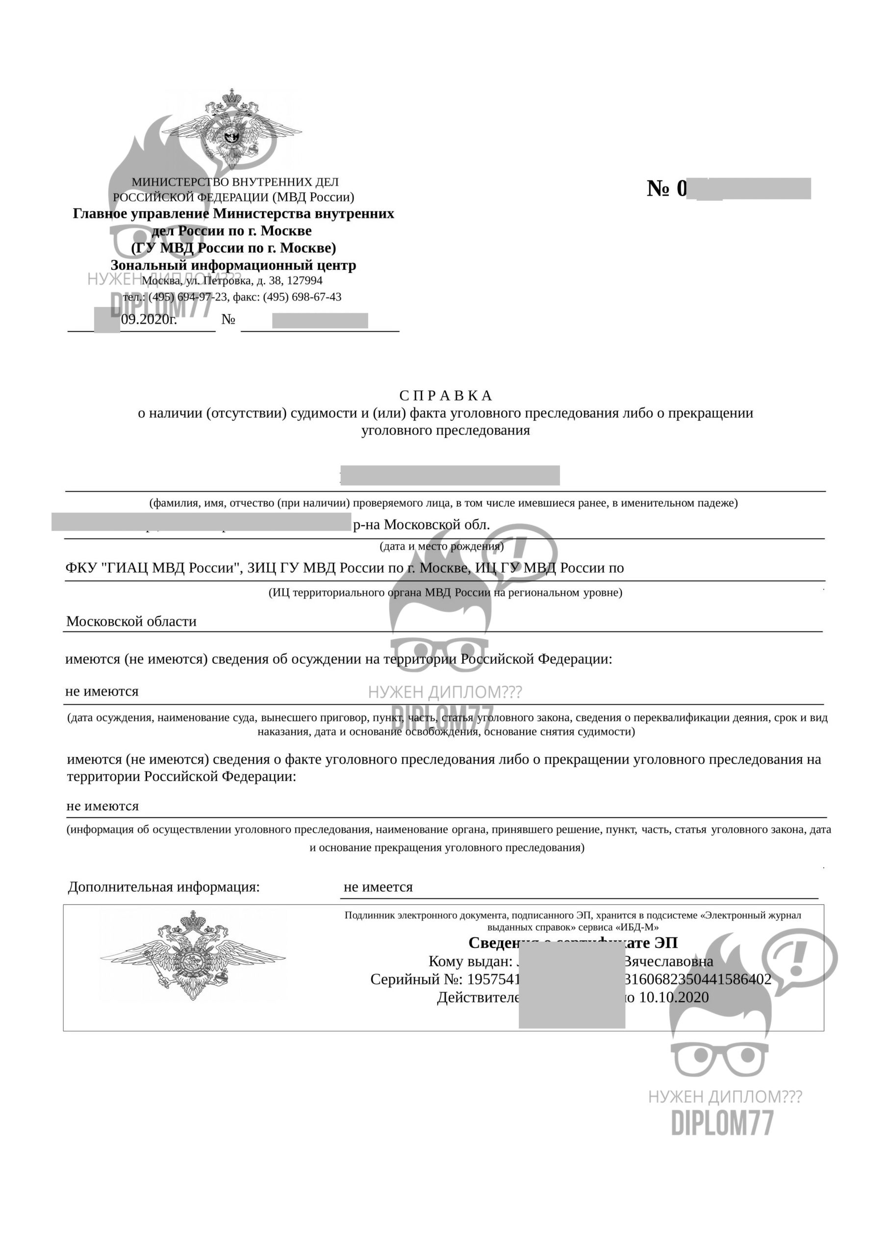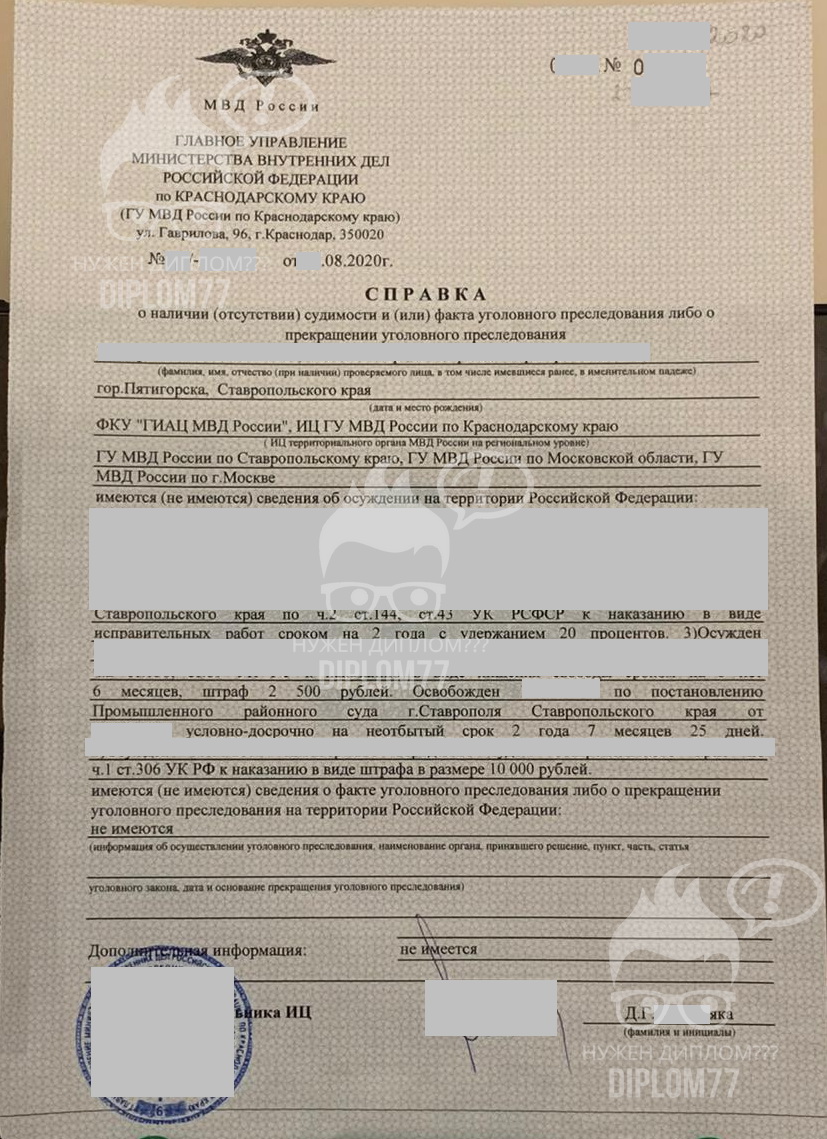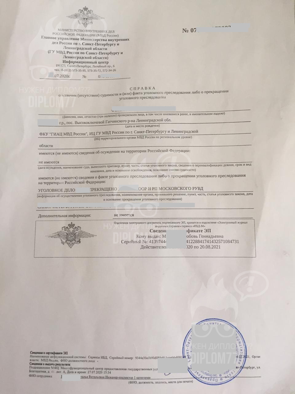 Справка об отсутствии судимости сегодня требуется в большом количестве жизненных ситуаций. Но что делать, если судимость была? Пусть она уже погашена, но зачем это показывать другим людям? Наилучшим решением будет купить справки о несудимости. И Диплом77 поможет вам это сделать максимально быстро и качественно. Мы много лет занимаемся изготовлением этих справок ещё с тех далёких времён когда их делали даже в ИЦ МВД на обычной белой бумаге. Поэтому мы можем сделать справку о несудимости с любого региона РФ (есть абсолютно все образцы).