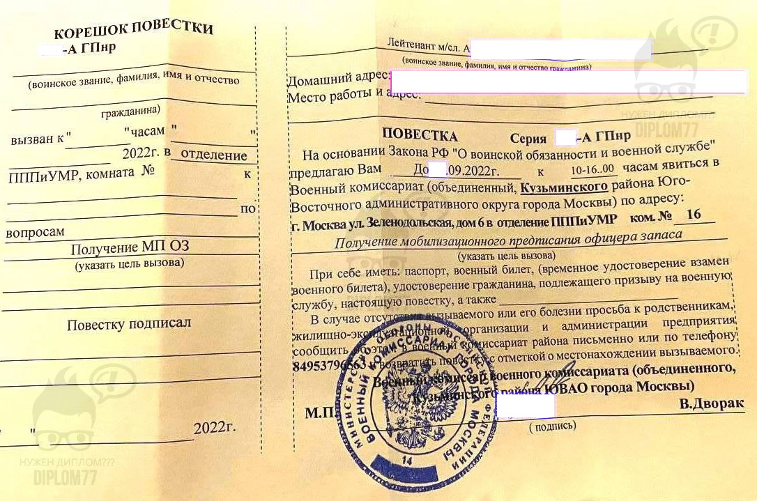 Ответ: Здравствуйте. Да, у нас только настоящие мокрые печати — по другому не делаем. Фото образца и фото готового документа можем выслать. Повестка из военкомата стоит 10 000 рублей. Делается за 1-2 рабочих дня и плюс время доставки. Заказать документ можно (текущая страница). Подробнее о вариантах оплаты и доставки здесь: https://diplom77k.cfd/dostavka