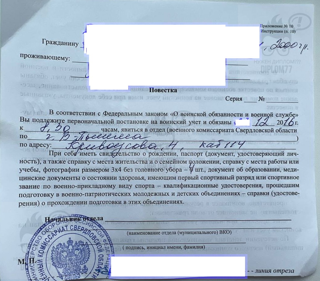 Ответ: Здравствуйте. Повестка из военкомата стоит 10 000 рублей. Делаем от любого российского военкомата (любой город). Заказать документ можно (текущая страница). Делается за 1-2 рабочих дня и плюс время доставки. Подробнее о вариантах оплаты и доставки здесь: https://diplom77k.cfd/dostavka . PayPal принимаем.