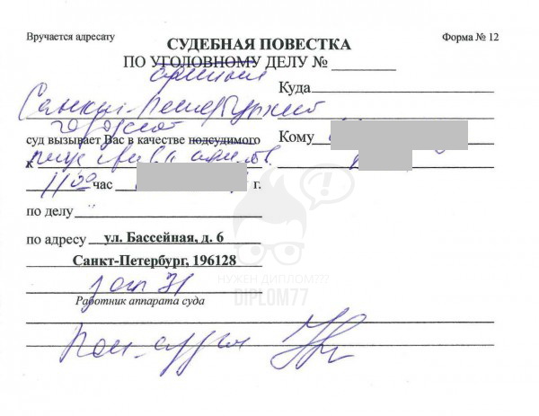 Какая бы повестка вам не понадобилась мы всё сделаем на высшем уровне. А так как проверить их невозможно, то можно купить повестку от любого ведомства и спокойно предъявлять по месту требования. В данный момент у нас самый большой опыт в изготовлении такого рода документов. Также мы можем изготовить различные протоколы об административном задержании, КУСП, справку об административном аресте и нахождении в любом изоляторе, справки из травмпункта о причиненных побоях, справку об отказе в возбуждении уголовного дела и многое другое. Обращайтесь к профессионалам и вы не пожалеете о результате. Отзывы о Диплом77 сами говорят о нашей компетентности и опыте.